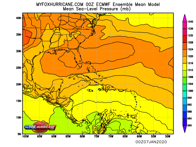 The graphics above show the barometric pressure field. Lower pressures are indicated in dark blue. Higher pressures are indicated in red. Hurricanes and tropical storms, as well as non-tropical low-pressure areas are associated with low pressure (Blue). The white lines are isobars (lines of equal pressure). The closer the lines are to each other, the stronger the winds.