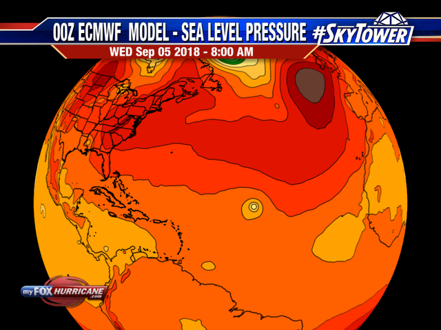The graphics above show the barometric pressure field. Lower pressures are indicated in blue to purple shades. Higher pressures are indicated in orange to red shades. Hurricanes and tropical storms, as well as non-tropical low-pressure areas are associated with low pressure (Blue). The black lines are isobars (lines of equal pressure). The closer the lines are to each other, the stronger the winds.