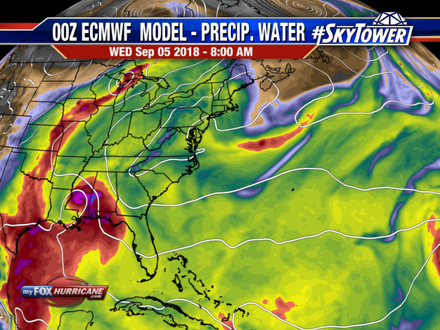 This map shows the precipitable water in the atmosphere. The areas shaded in reds and purple indicate higher amounts of total moisture in the atmosphere. The brown and gray areas indicate a drier atmosphere. The white lines are isobars (lines of equal pressure). The closer the lines are to each other, the stronger the winds.