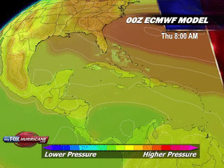 The graphics above show precipitation rate and mid cloud cover. Light green shades indicate light rain. Yellow and orange shades indicate heavier precipitation. The global perspective of this model is useful in watching tropical waves exiting the African coast and moving into the Atlantic during the Hurricane season.