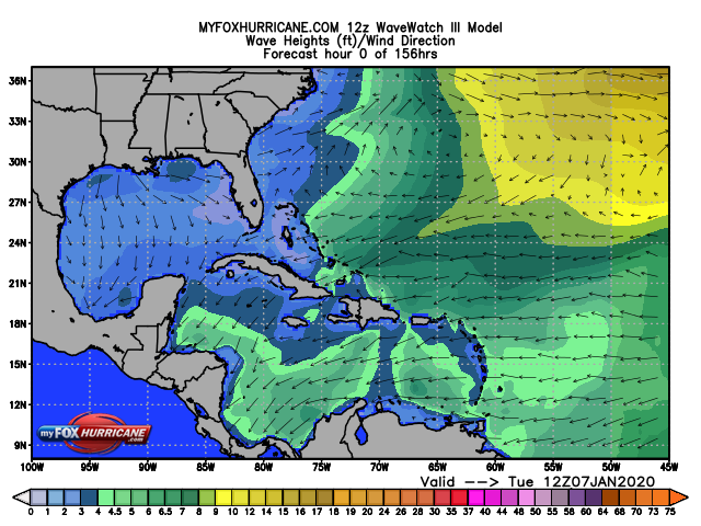 In addition to wave heights, WAVEWATCH III forecasts wind speed over ocean areas, as well. White arrows indicate wind direction and speed. Short arrows are light winds and longer arrows show stronger winds.