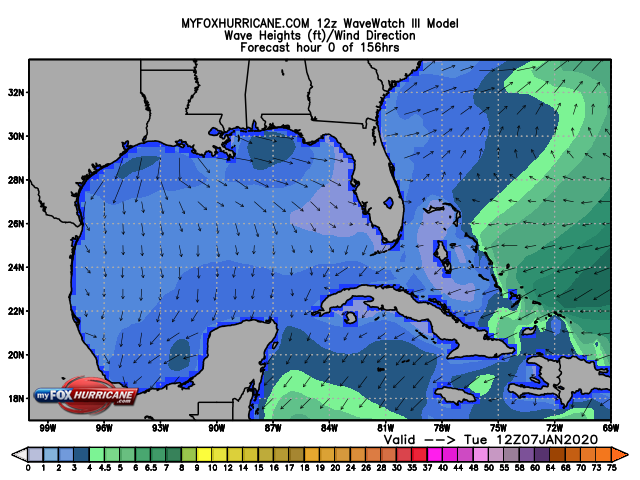In addition to wave heights, WAVEWATCH III forecasts wind speed over ocean areas, as well. White arrows indicate wind direction and speed. Short arrows are light winds and longer arrows show stronger winds.